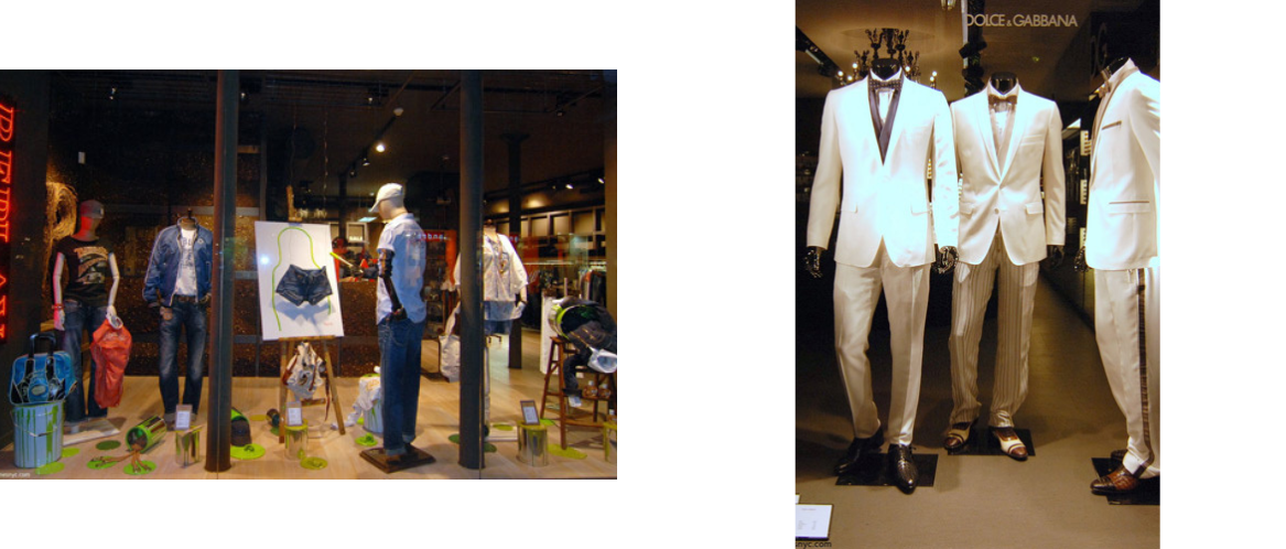 Le style italien se distingue par sa richesse culturelle et son sens dramatique. Chez Dolce & Gabbana, les vitrines mêlent élégance, codes baroques et influences méditerranéennes, portées par des mannequins sans tête qui laissent toute la place aux silhouettes et aux matières. Ces formes épurées offrent aux merchandisers une liberté créative totale, transformant chaque mise en scène en hommage visuel à l’histoire et à l’art italiens.