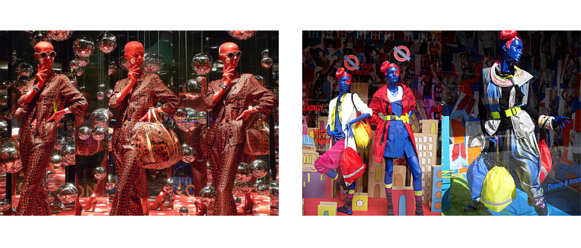 Chez Selfridges, chaque vitrine est un spectacle à part entière. En combinant couleurs éclatantes et décors audacieux, les créations captent immédiatement le regard. Plutôt qu’une simple présentation de produits, chaque mise en scène explore un univers visuel unique, parfois minimaliste, parfois totalement immersif — mais toujours expressif.