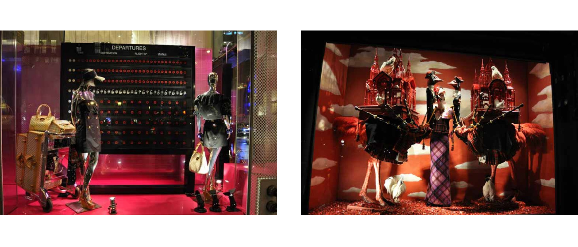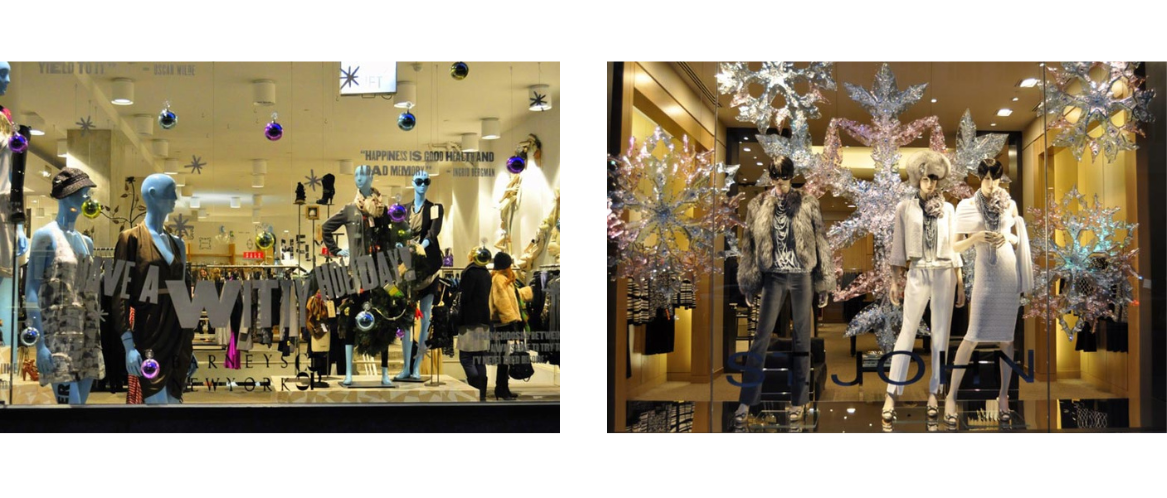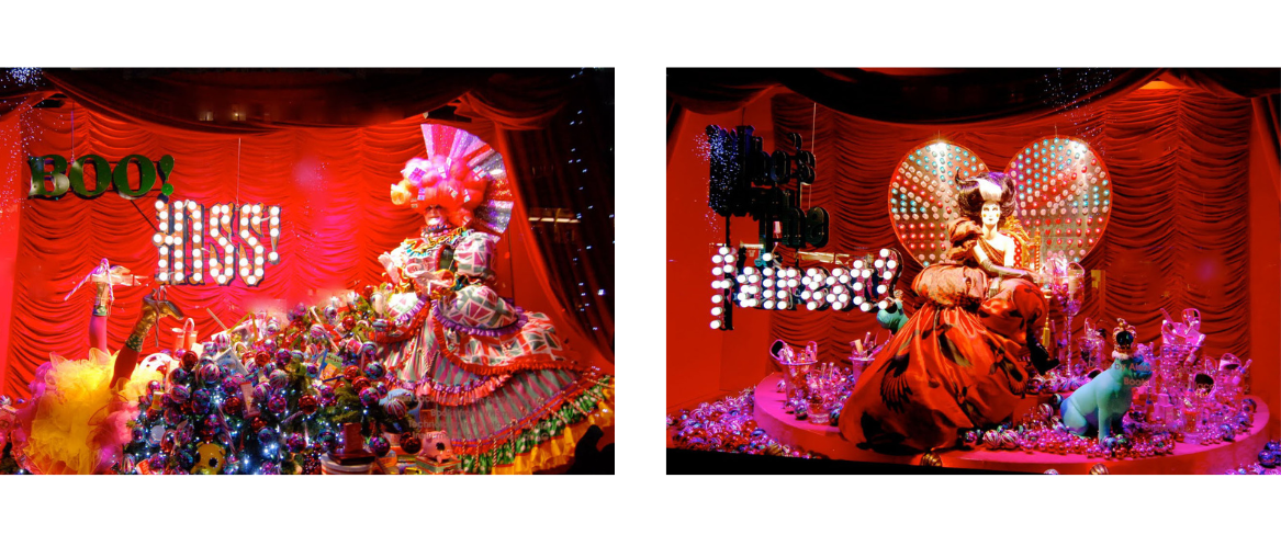 À New York, les vitrines deviennent des attractions touristiques à part entière. De la 5ᵉ Avenue à Herald Square, les enseignes présentes multiplient les décors spectaculaires et les arrangements de mannequins travaillés pour faire de chaque vitrine une œuvre vivante, souvent influencée par les saisons ou les événements culturel.