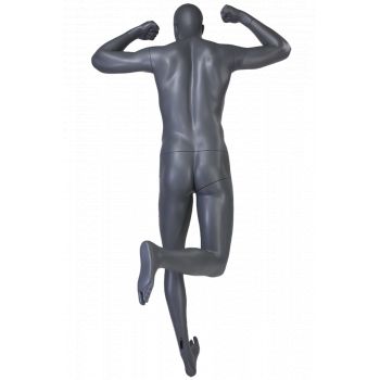 Die männliche SPORT-Mannequin MNHJ-01 befindet sich in einer siegreichen kleinen Laufposition, die Arme in der Luft und die geschlossenen Fäuste dicht vor dem Gesicht. Er ruht auf seinem linken Bein, dessen Fußspitze angehoben ist, und das rechte Bein ist nach hinten gebeugt.