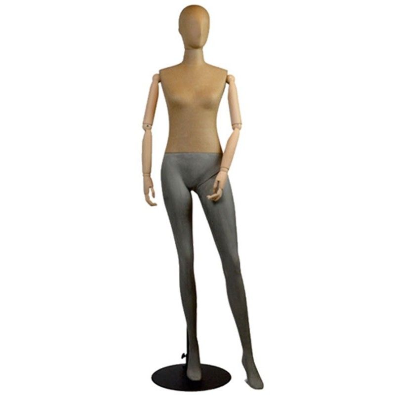 This articulated female mannequin with abstract head features a modern design and great adaptability. Designed for sophisticated window displays, it offers maximum flexibility thanks to its articulated wooden arms, which enable you to create varied, dynamic poses. This model is ideal for presenting your clothing collections in a creative and unique way. The beige fabric bust adds a natural texture, while offering a neutral surface that enhances the garments. Its slender silhouette with a slightly forward leg accentuates feminine elegance, perfect for presenting casual outfits as well as dressier looks.