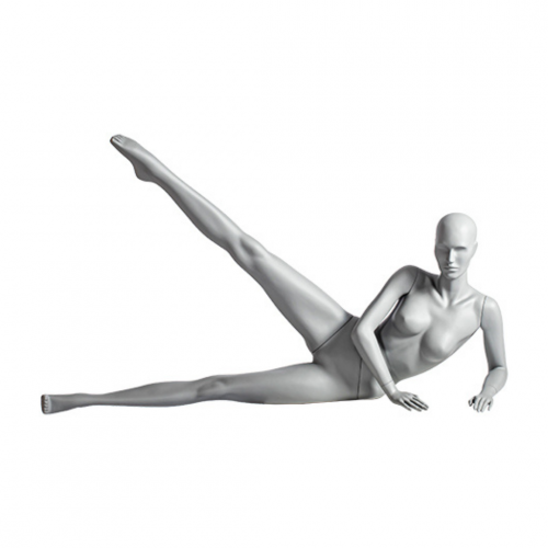 Il manichino WS33 è nella posizione fitness con sollevamento laterale delle gambe. Si sdraia su un fianco, appoggiandosi su un gomito, mentre una gamba è tesa verso l'alto, l'altra rimane tesa. Il manichino è perfettamente allineato e la gamba sollevata con un'angolazione che evidenzia flessibilità e tono muscolare, simulando una postura di allenamento fitness. Questo manichino da finestra si rivolge maggiormente agli sport come la ginnastica, lo yoga o il fitness, nonché all'abbigliamento compatibile con queste discipline.