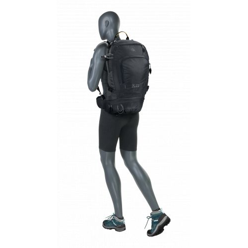 Le mannequin SPORT femme SPL-10 est dans une position de marche à pied, bras pliés et main vers les épaules, en train de tenir les bretelles de son sac à dos. En train de marcher, ses jambes sont dans une position qui prend peu de place au sol. Le pied gauche est en appui sur le sol et la jambe droite est en arrière, très légèrement repliée.